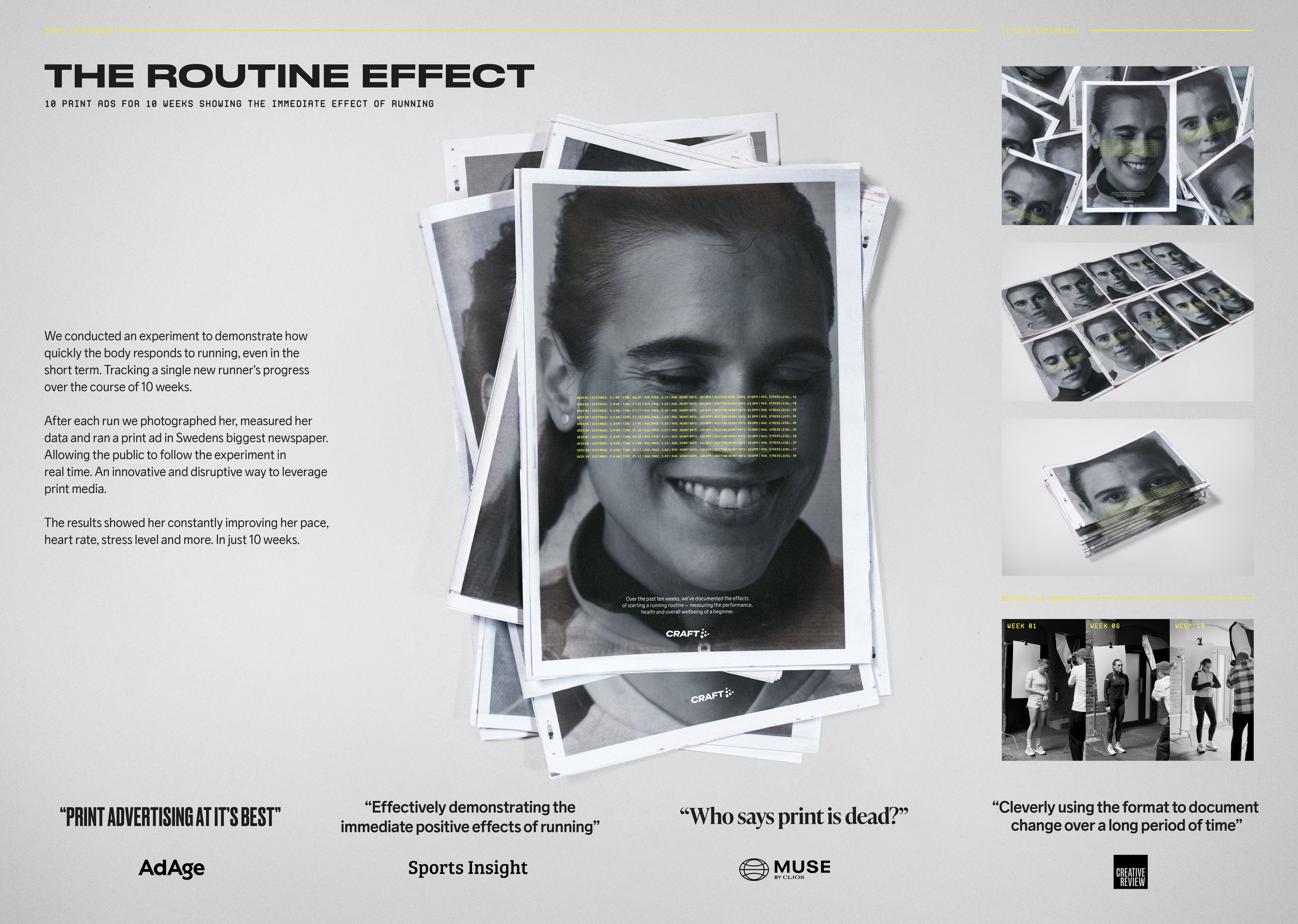 Emelie, a student from Gothenburg, agreed to start running once a week for 10 weeks. She allowed us to document her progress using an advanced Garmin watch that she wore 24/7, that monitored her running and health data. For ten weeks, we set up a temporary outdoor portrait studio at the spot where Emelie finished her weekly runs. Immediately after each run, we photographed her and added data from her run together with her general health metrics from the week, which was then published in an ad in Swedens biggest newspaper.